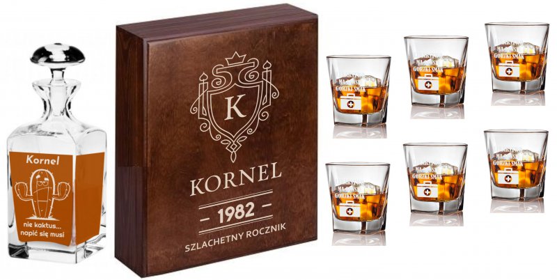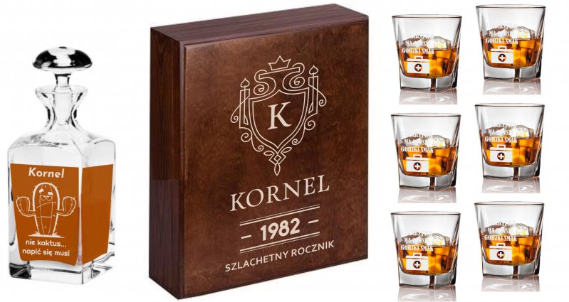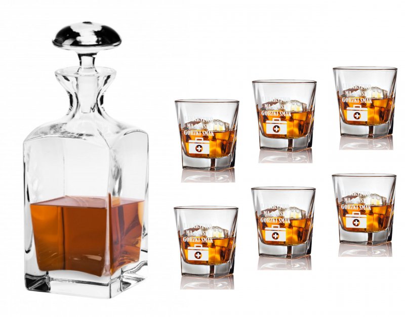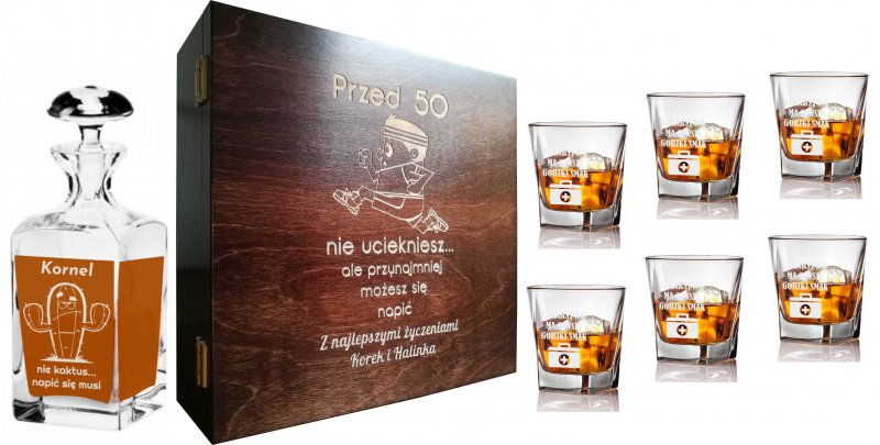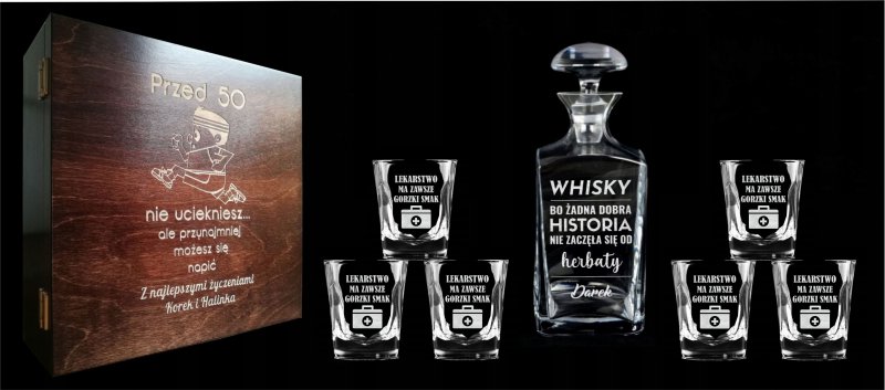 Po zakupie prosimy określić (wybrać) wzór na karafkę oraz napisać w osobnej wiadomości co ma być wygrawerowane na szklankach oraz pudełku.